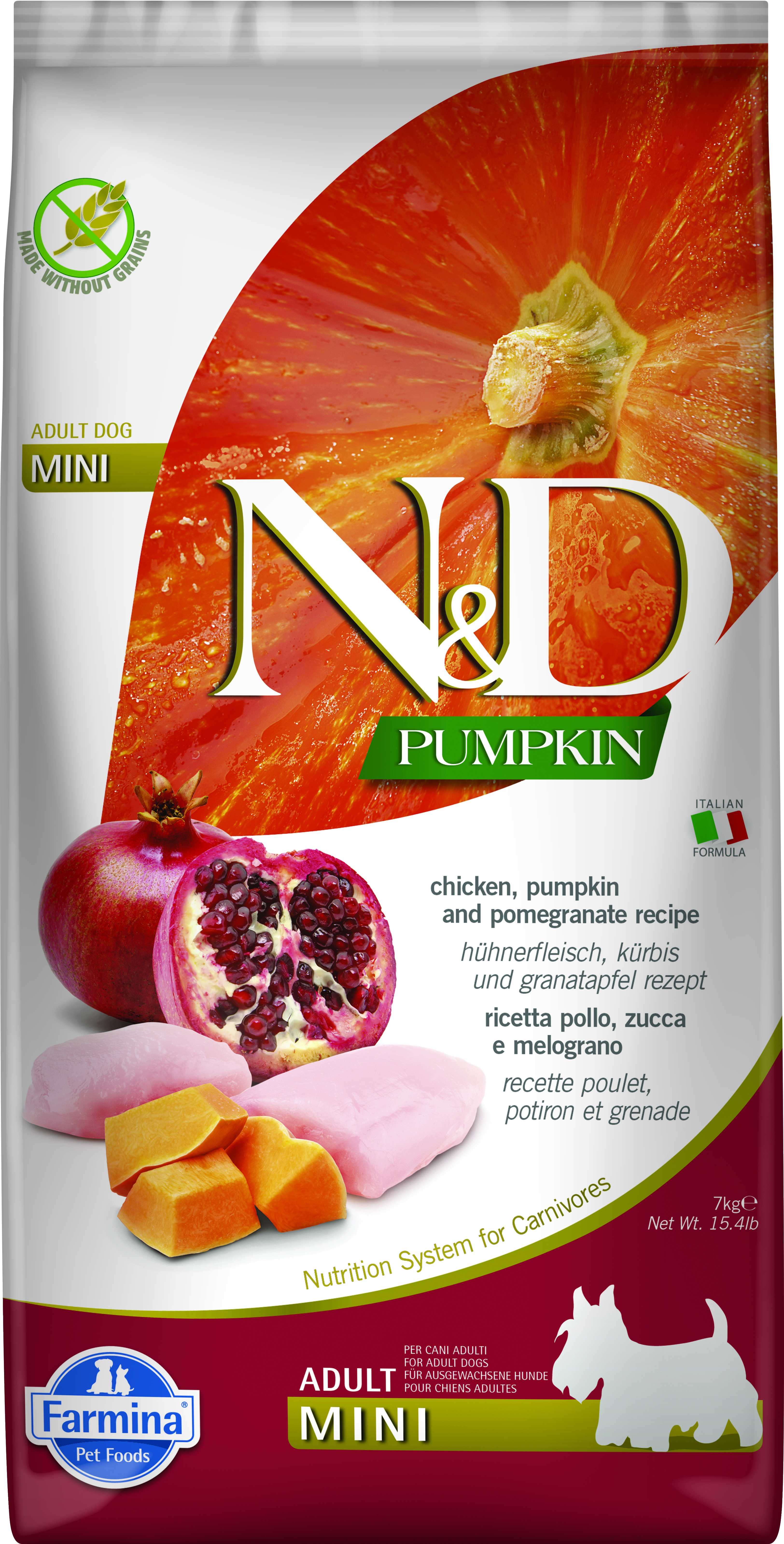 Skład: kurczak bez kości (24%), dehydratyzowane białko z kurczaka (22%), skrobia grochowa, tłuszcz z kurczaka, suszona dynia (5%), suszone jaja, śledź, dehydratyzowane białko ze śledzia, olej z ryb (ze śledzia), włókno grochu, suszona marchew, mączka z lucerny, inulina z cykorii, fruktooligosacharydy, ekstrakt z drożdży (źródło mannooligosacharydów), suszony owoc granatu (0.5%), suszone jabłko, suszony szpinak, łuski i nasiona babki płesznik (0.3%), suszona pomarańcza, suszone borówki, chlorek sodu, suszone drożdże piwne, kurkuma (0.2%), wyciąg z aloesu, glukozamina, siarczan chondroityny.