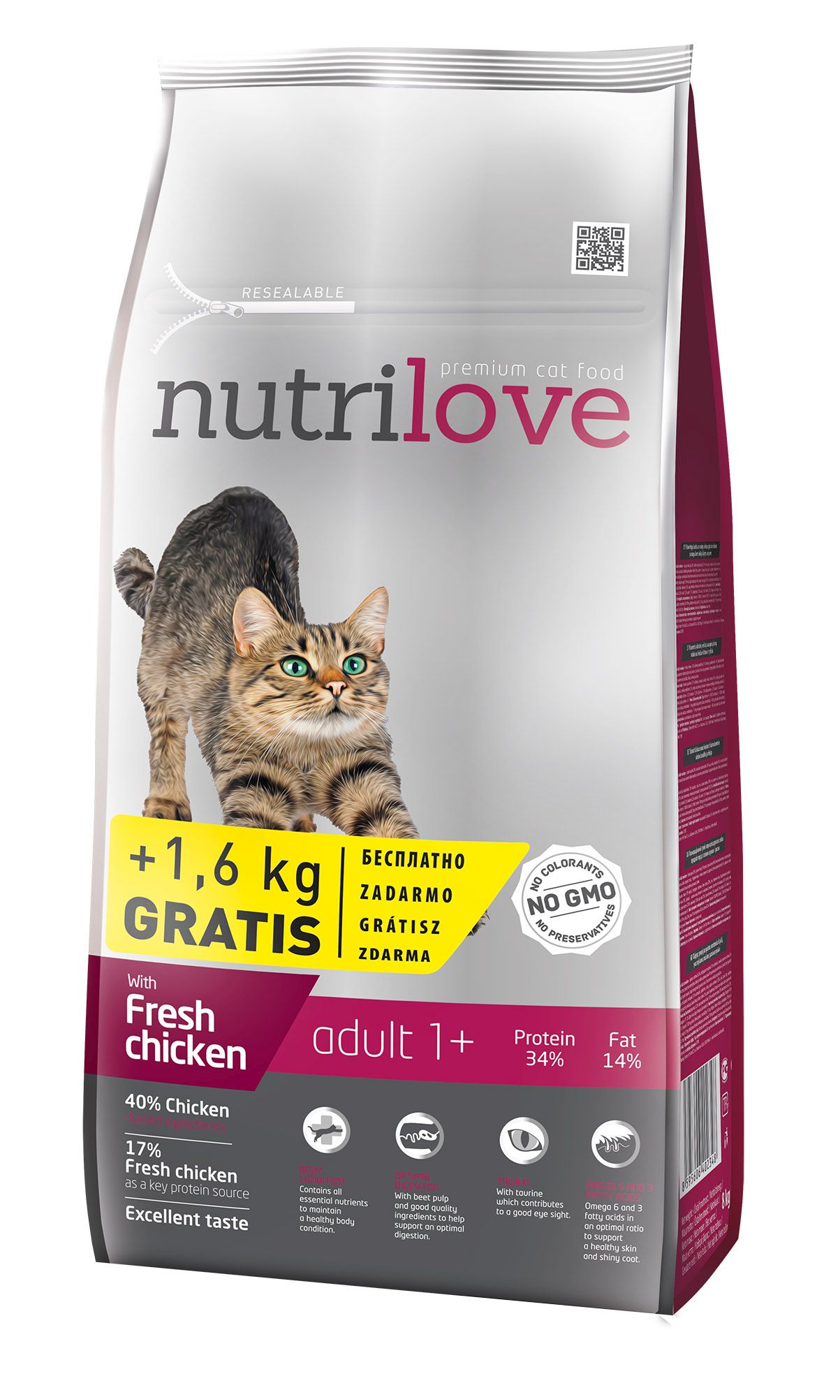 Nutrilove Adult – (świeży kurczak 17%, suszony drób (23% kurczaka), drób ogółem 40%) jest wysokiej jakości karmą dla dorosłych kotów wszystkich ras. Zawiera kwasy tłuszczowe Omega 6 i Omega 3 dla zdrowej skóry i lśniącej sierści. Doskonały smak bez dodatku sztucznych aromatów, ze świeżym kurczakiem. Bez dodatku konserwantów i barwników. Wszystko, czego Twój kot potrzebuje.