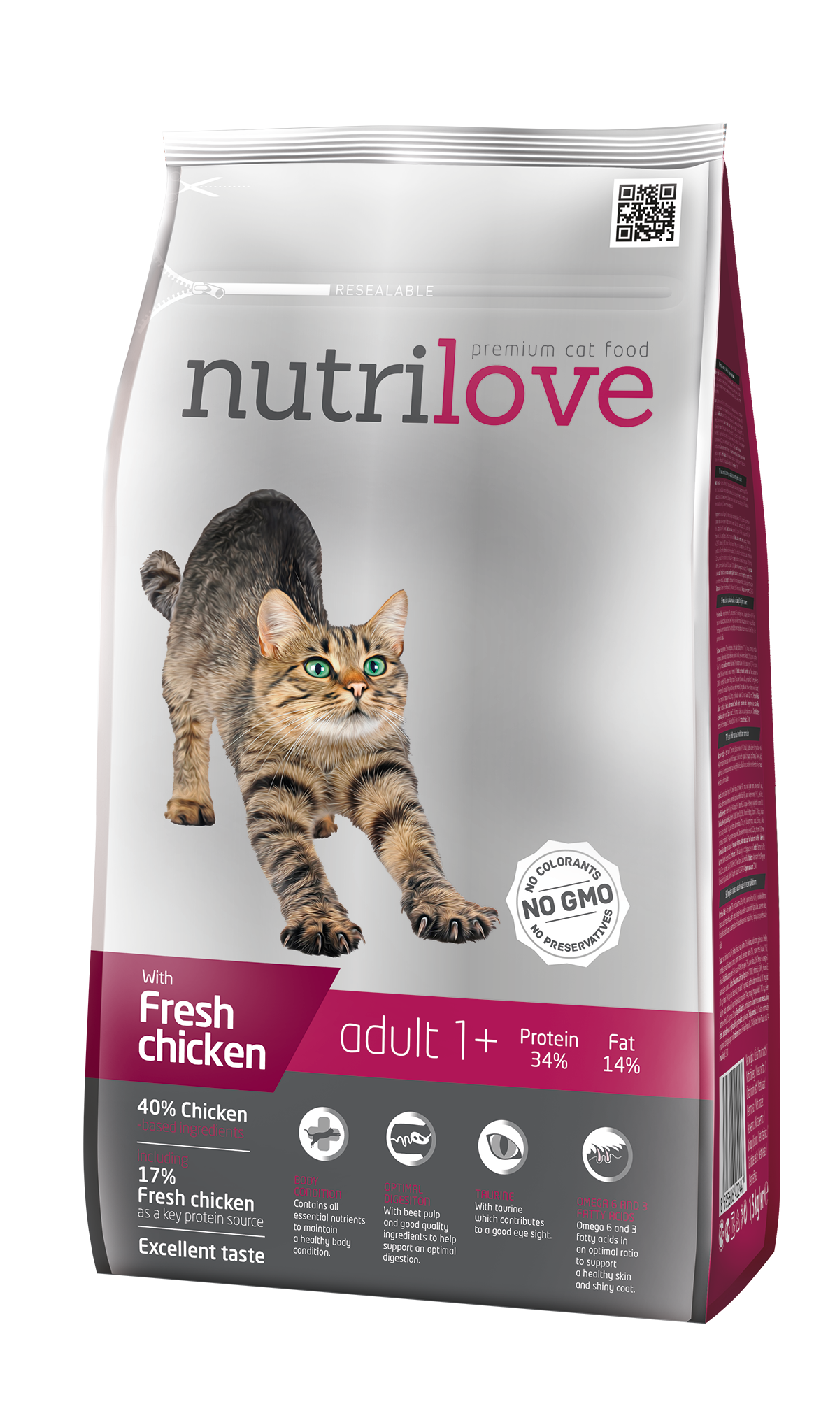 Nutrilove Adult – (świeży kurczak 17%, suszony drób (23% kurczaka), drób ogółem 40%) jest wysokiej jakości karmą dla dorosłych kotów wszystkich ras. Zawiera kwasy tłuszczowe Omega 6 i Omega 3 dla zdrowej skóry i lśniącej sierści. Doskonały smak bez dodatku sztucznych aromatów, ze świeżym kurczakiem. Bez dodatku konserwantów i barwników. Wszystko, czego Twój kot potrzebuje.