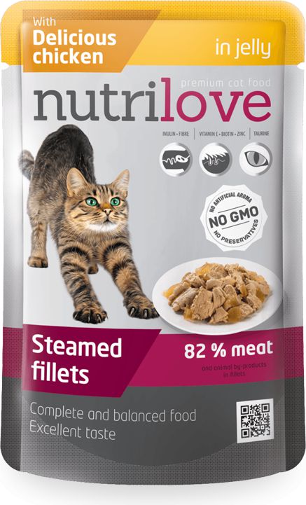 Nutrilove – gotowane na parze delikatne fileciki z kurczakiem w galaretce to wysokiej jakości pełnoporcjowa karma dla dorosłych kotów. Twój kot doceni doskonały smak bez dodatku sztucznych aromatów i konserwantów. Wszystko czego Twój kot potrzebuje.