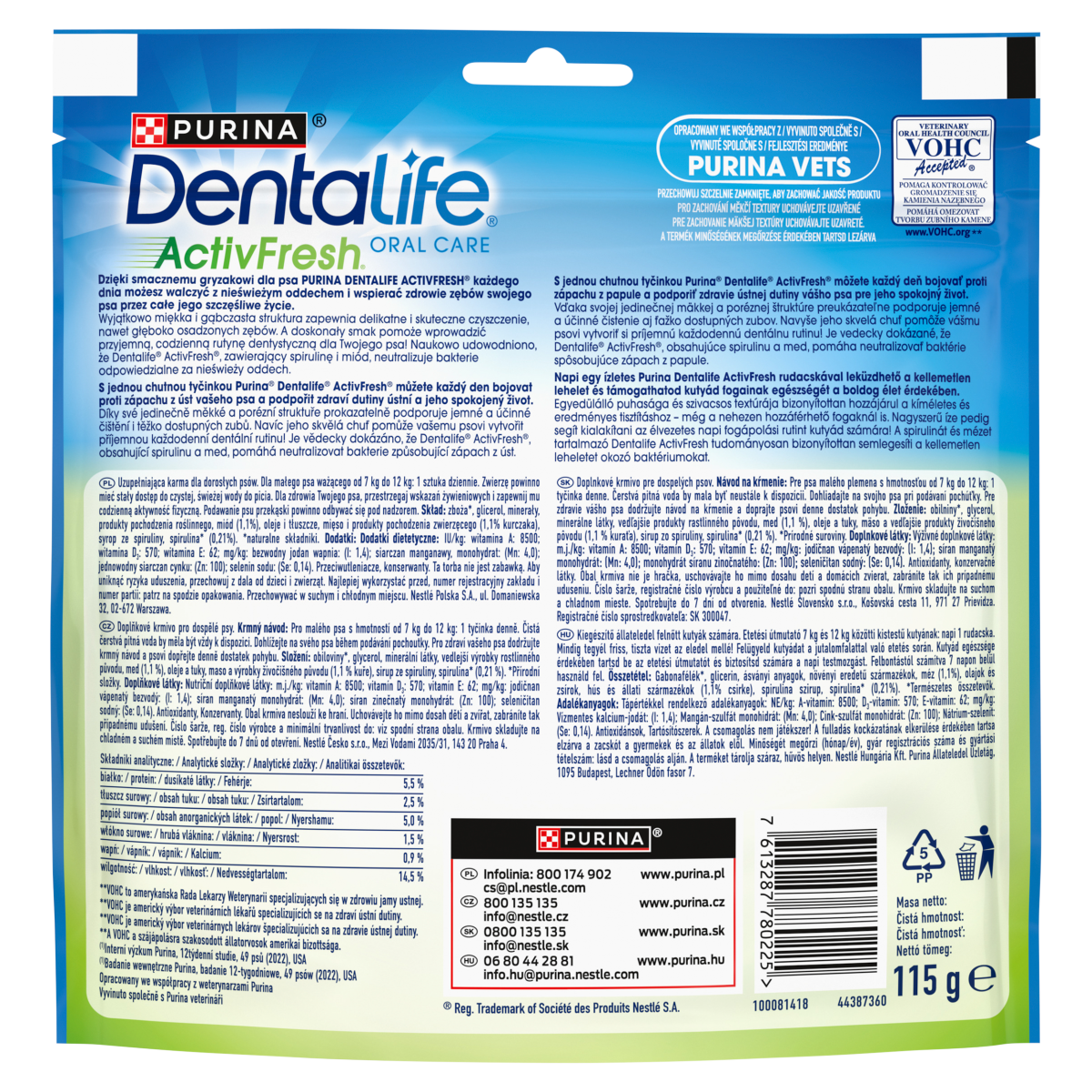 Purina Dentalife ActivFresh z naturalną spiruliną i miodem nie działają powierzchownie, jedynie maskując nieprzyjemny oddech, ale są zaprojektowane by neutralizować bakterie odpowiedzialne za jego powstanie. Kształt, rozmiar i gąbczasta struktura ActivFresh zostały stworzone wg formuły Dentalife, która w sposób potwierdzony naukowo zmniejsza gromadzenie się kamienia nazębnego.